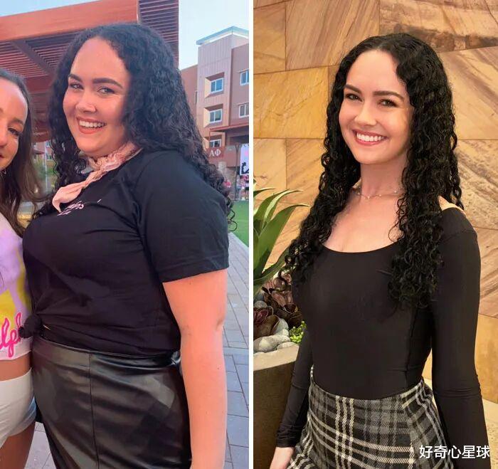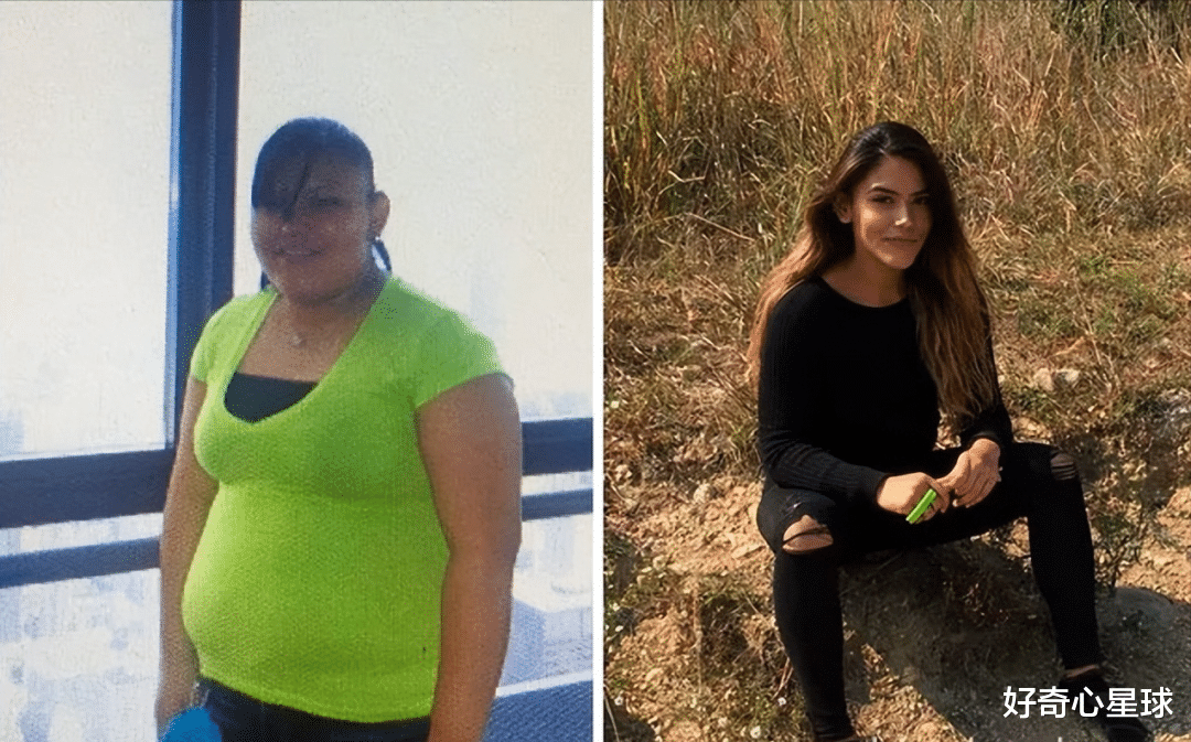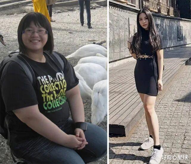 同一个女孩。第一张,160斤,圆脸双下巴,穿着黑色T恤,眼神迷离。第二张,减掉100斤后,颜值让人无法拒绝。
