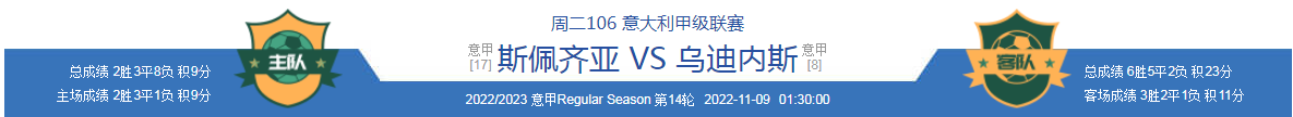 乌迪内斯也是意甲老油条,但是实力在意甲也仅仅只能算是中下游水平,本赛季表现较为突出,目前合计6胜5平2负,积23分排名意甲第7位,算是球队高光时刻,最近一场比赛主场面对升班马莱切,最终居然被对手逼平了事,目前4平2负近6场比赛不胜,上场被逼平后,士气同样较为低迷,但是今天面对时3连败的斯佩齐亚,球队必定努力争取反弹。