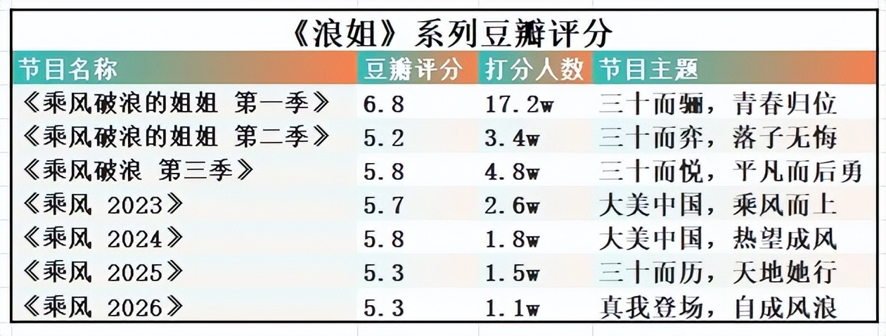 七季《浪姐》,除第一季之外,其余六季豆瓣评分均未达到及格线,且打分人数在第一季后出现了断崖式下跌。