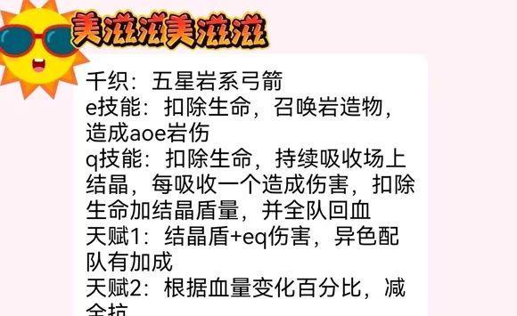 且来看看千织的定位和技能机制,千织是4.5up的五星岩辅奶妈,职业是弓箭。E技能:扣除生命,创造岩造物对附近的目标造成Aoe岩伤,Q技能:扣除生命,持续吸收结晶,每个结晶能够造成伤害、减血、加晶盾量,然后全队回血。天赋1,结晶盾增加EQ伤害,异色配队有加成;天赋2,根据血量蹦迪百分比减全抗。