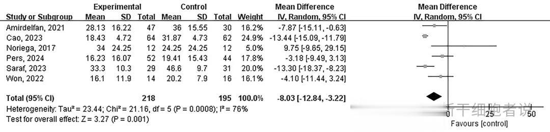 森林图显示了细胞治疗对最后随访时慢性腰痛ODI评分的影响