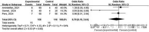 结果显示,体细胞疗法在改善VAS评分[MD=-12.04,95% CI(-17.35,-6.72)]和ODI评分[MD=-8.03,95% CI(-12.84,-3.22)]方面效果显著,且未增加严重不良事件发生风险[OR=0.70,95% CI(0.19,2.64)]。结果证明了体细胞疗法在慢性下腰痛的治疗中展现出显著疗效。