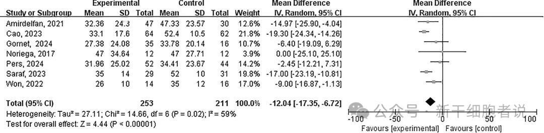 森林图显示了细胞治疗对最后随访时慢性腰痛VAS评分的影响