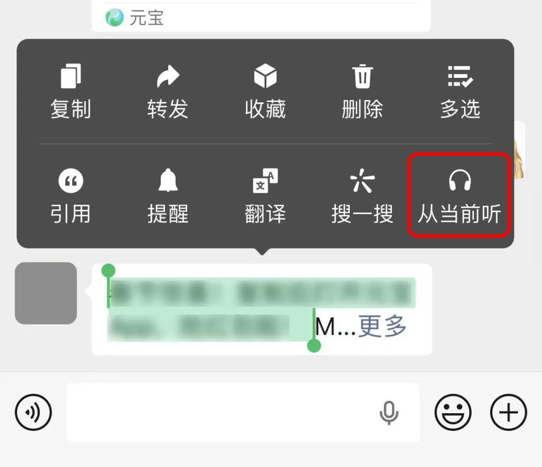 当在聊天界面长按消息时,功能菜单中新增了“从当前听”的新按钮,点击即可将消息以音频方式播放出来。