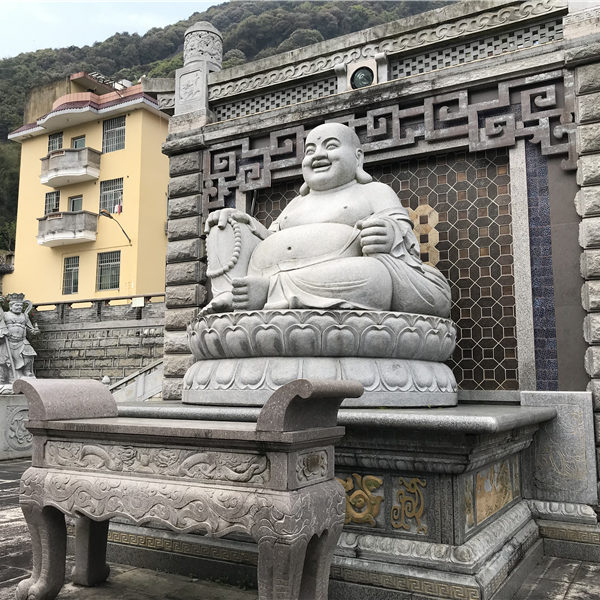 喜笑颜开的石雕弥勒佛,是我们耳熟能详的一种寺庙石雕佛像类型,“大肚能容、笑口常开”是石雕弥勒佛的核心形象。常见的石雕弥勒佛表情庄重中带着笑意,其圆润可爱的造型和流畅的线条,十分富有喜感和亲和力,每当我们抬头仰望弥勒佛石雕像时,心中的烦恼好像也烟消云散了一般。细心的朋友一定会发现,运用不同材质雕刻而成的石雕弥勒佛,不仅外观颜色质地不同,其象征寓意也会随着发生变化。