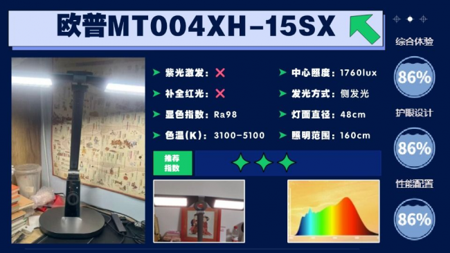 哪个品牌的护眼台灯性价比高?欧普MT004XH-15SX的双翼镂空灯头设计比较有辨识度,外观上很吸睛。灯臂厚度仅2cm,也比较节省空间。约48cm发光面能覆盖1.6米区域,显色指数Ra98,色彩还原不错。同时支持3500K-5000K色温调节,灯头能上下翻转。不过在实际使用的时候,传感器偶尔有误触情况,触控区也要注意避免误碰。整体适合对外观和基础智能有要求的人群。