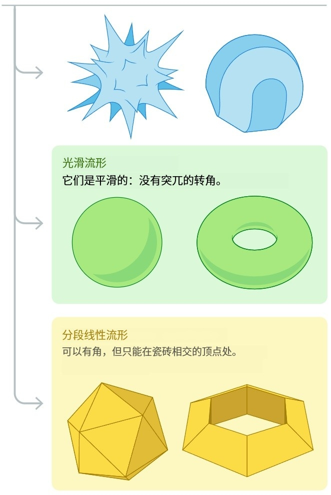 最复杂的类型是“光滑”流形。它具有拓扑流形的所有特征ーー平坦、连续ーー但它还有更多的东西。用手指在上面划过,道路总是很平坦,你永远不会像在拓扑流形上那样碰到一个突然的拐角。
