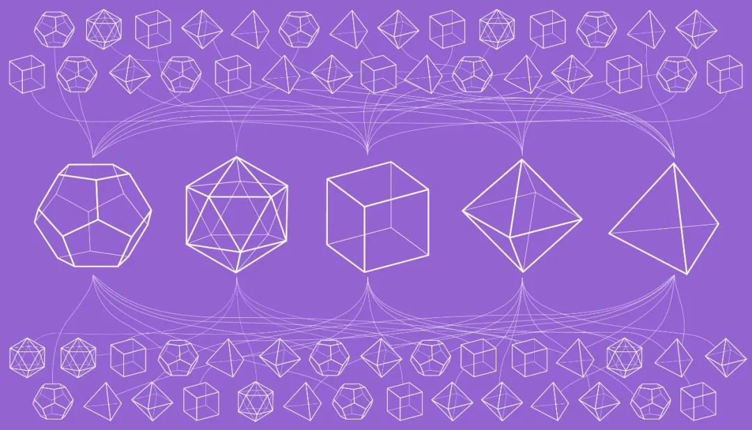 柏拉图立体(或正多面体)包括(从左起) : 十二面体,二十面体,立方体,八面体和四面体,图片来源:Quanta Magazine