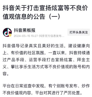 属于是“昨天还在炫耀钱,今天账号已禁言”。看看抖音等平台新发布的公告,其中原因便不言自明。