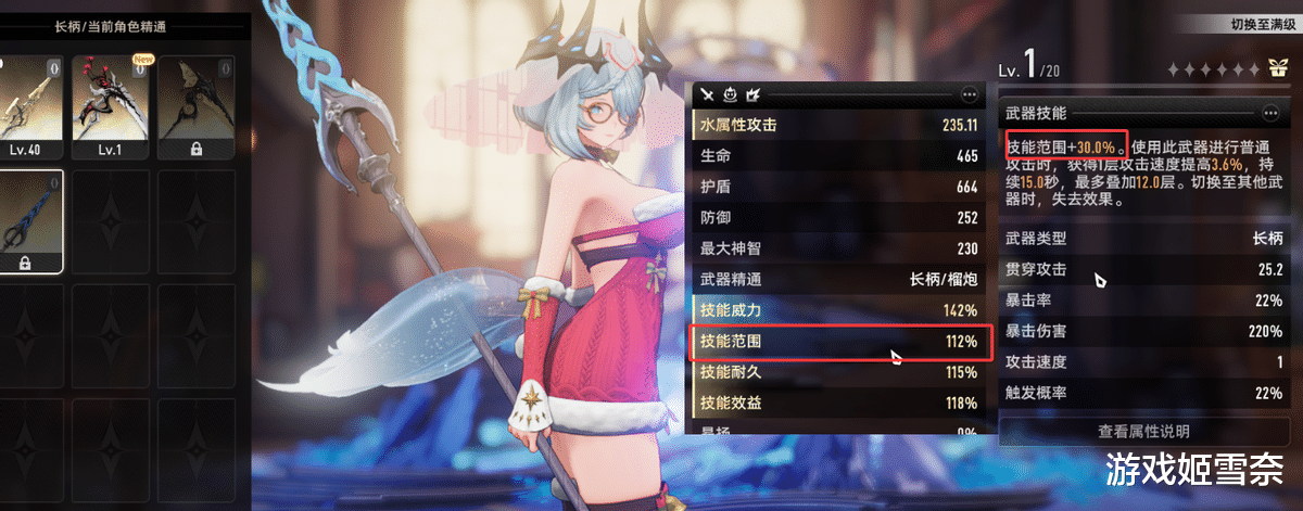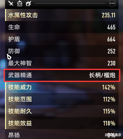 武器选择要看两方面,一个是角色的武器精通,通过角色武器精通筛选出角色需要的武器类型,然后再去全武器里面找,比如说我这个是长柄精通,那就在长柄武器里找需要的词条,需要的词条就是角色属性的金色词条,也就是说我们只要找这个角色精通里有提升需要的词条的武器即可。