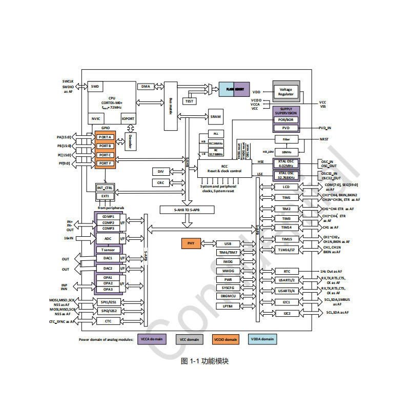 芯片内置 7 通道 DMA 控制器,支持数据传输,有助于降低 CPU 负担,适合需要大量数据传输的应用场景。包含 1 路 12 位 ADC,支持最多 16 个外部输入通道,输入电压转换范围为 0–VCCA;2 路 12 位 DAC,支持 2 个通道;3 路比较器,用于比较模拟信号;3 路运算放大器,可对模拟信号进行放大、滤波等处理。此外,支持 836/440 型 LCD,便于连接液晶显示屏,用于人机交互。