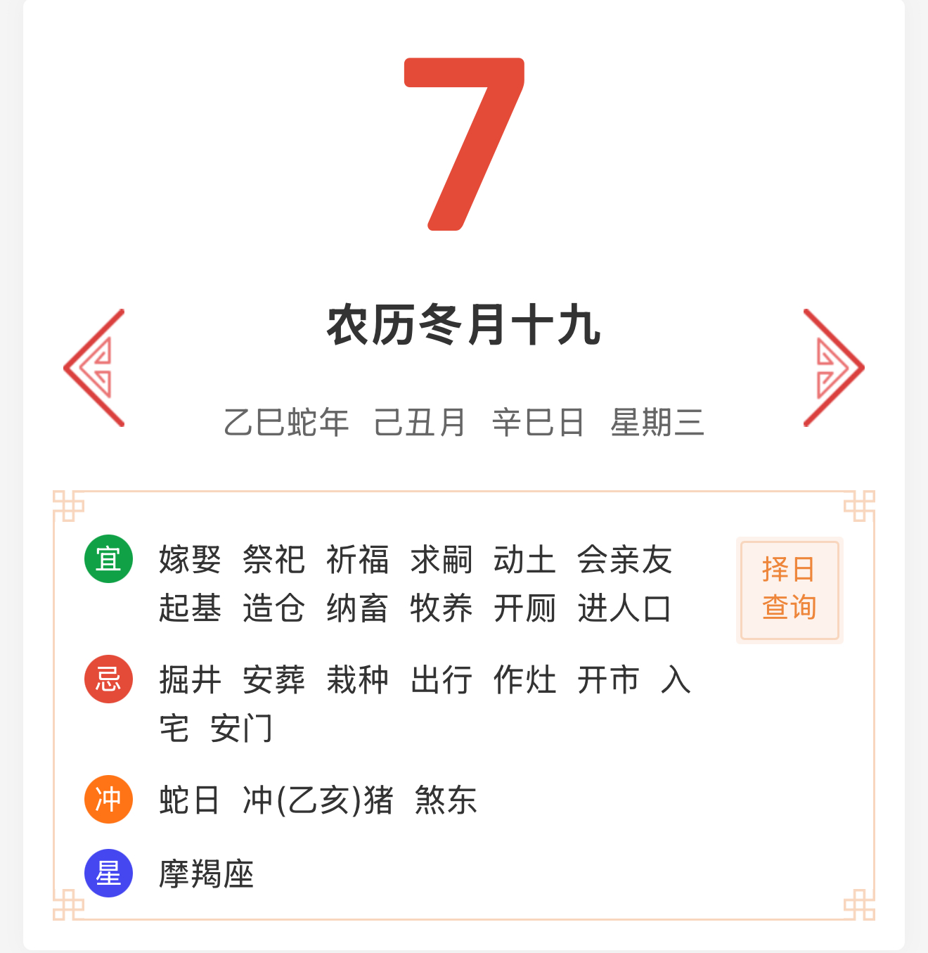 2026 年 1 月 7 日对应农历冬月十九,干支为乙巳蛇年己丑月辛巳日,冲猪煞东,五行属白蜡金,胎神方位在厨灶床外正西,这些基础信息为后续民俗活动提供了背景支撑。当日核心宜忌明确:宜嫁娶、祭祀、祈福、求嗣、动土、会亲友等 11 项事务,其中嫁娶象征新人连理,动土寓意基业开端;忌掘井、安葬、栽种等 8 项,需避免相关活动以顺应民俗逻辑。吉时规划至关重要:丑时适合祈福求嗣、嫁娶出行,申时利于求财交易与修造安葬;凶时如寅时需规避,合理安排时间可提升事务顺利度。民俗应用场景中,该日入选卜易居吉日列表,领证可择吉时增强仪式感,上香需避开忌时与煞东方位,结婚搭配宜项中的动土起基,能寓意新人基业稳固。需特别注意禁忌:冲猪人群应避重要事务,煞东方位忌开展活动,彭祖百忌提示 “辛不合酱、巳不远行”,规避细节可降低民俗风险。综合来看,此日在婚嫁、祈福、亲友聚会等场景适用性强,建议结合自身需求参考吉时与宜忌规划行程,让传统黄历智慧助力现代生活安排。