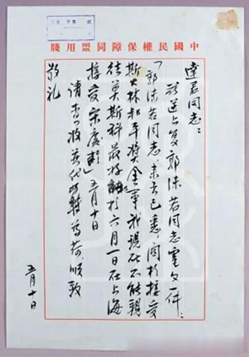 信中附送致郭沫若复信,就其询问能否亲赴莫斯科接受斯大林国际和平奖金一事做了回复,并请梅达君代转。函谓:“兹送上复郭沫若同志电文一件:‘郭沫若同志:来函已悉,关于接受斯大林和平奖金事,我现在不能亲往莫斯科,最好于6月1日在上海接受。宋庆龄,5月10日。’请查收并代转为荷。”