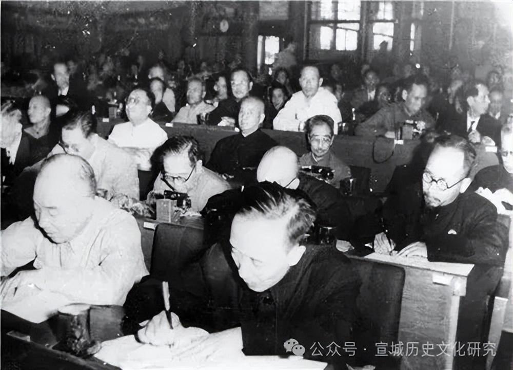 图六:中国人民政治协商会议中的民进人:第三排左二梅达君,左三王却老,左四周建人,第一排左二郭沫若