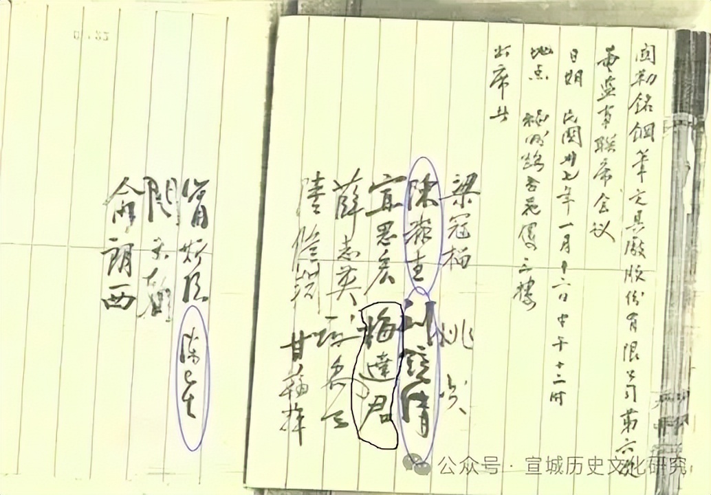 梅达君作为关勒铭金笔厂董事的签名,圈中4人分别表示梅老、陈氏兄弟与化名刘镜清的刘晓。关勒铭金笔厂是1944年受党组织委派的关键据点,以“实业救国”为掩护开展统战工作。