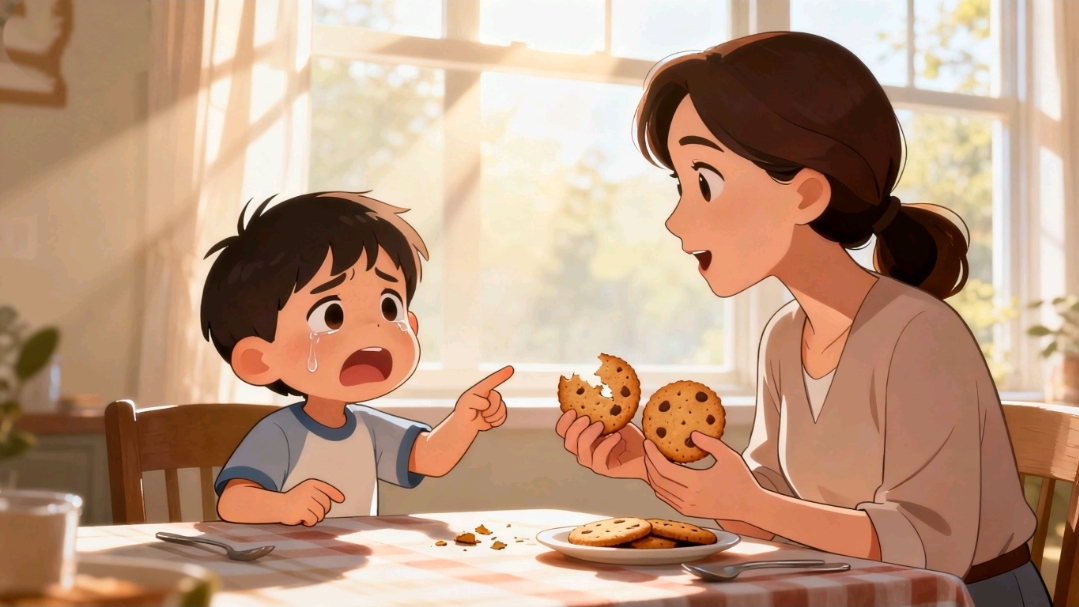孩子因为饼干碎了哭,别讲“碎了也能吃”,而是问:“饼干碎了,你是不是想再要一块完整的?还是想先吃碎的,妈妈再给你拿一块?”
