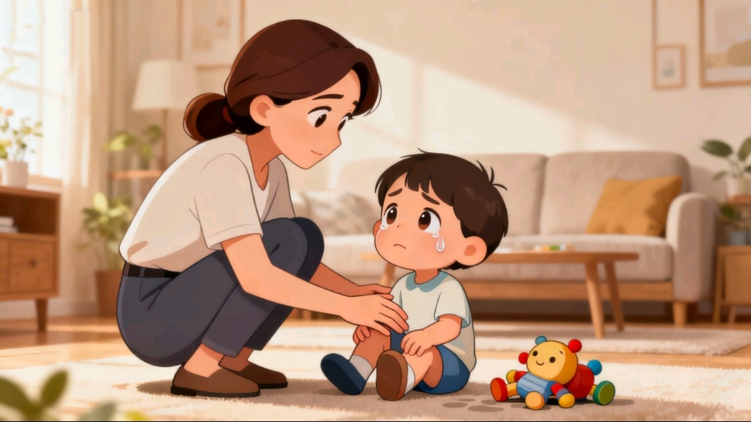 孩子摔了哭,别先拉他起来说“不疼”,而是轻轻抱他,摸一摸他的小膝盖:“妈妈看到你摔了,膝盖有点疼对不对?疼得想哭对不对?”