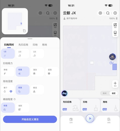 你可以选择只扫地、只拖地,也可以选择【先扫后拖】或者【扫拖同时】