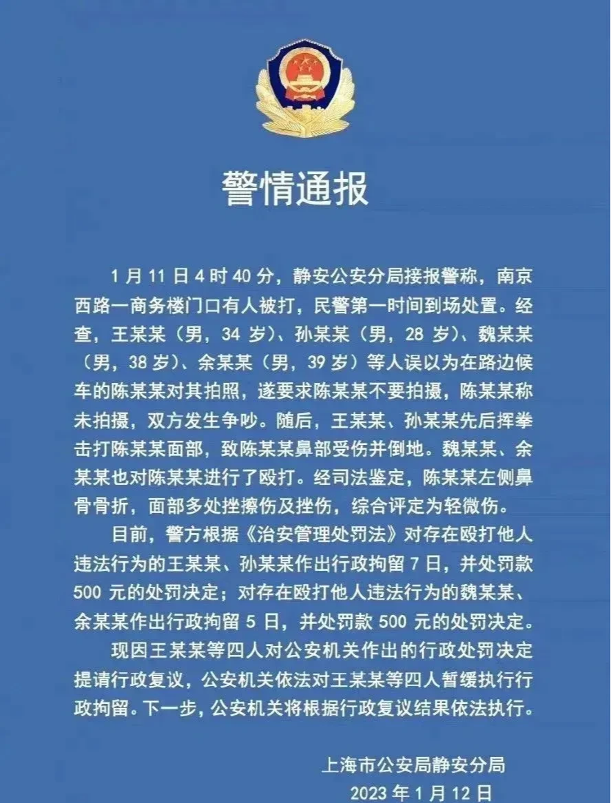 而后,男子魏某某和余某某加入打人的队伍,陈某某直接被围殴。经医学鉴定,虽然陈某某多处受伤,但是均是挫伤,结果只是轻微伤。公安机关通报,对王思聪拘留7日,罚款500元,其他4人被拘留和罚款。目前王思聪等4人均提出行政复议,处罚暂缓执行。