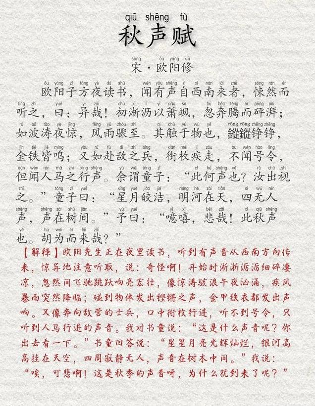 欧阳修辗转难眠,旁边的小书童早就把脑袋埋进被子里,进入了梦乡。唉,小孩子总是这么没心没肺的,可成年人的世界紧早已经草木皆兵了。欧阳修弯下腰,拿起笔,写下了这篇流传千古的奇文《秋声赋》。