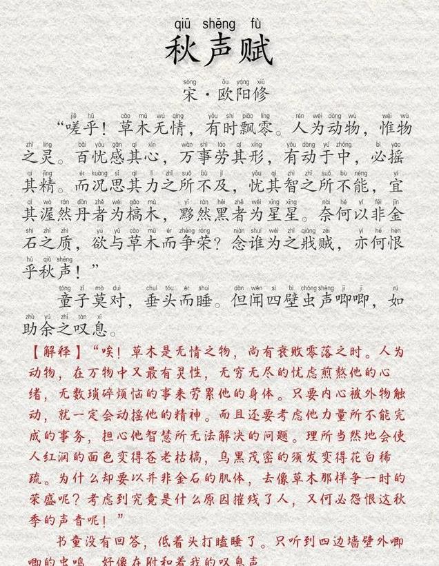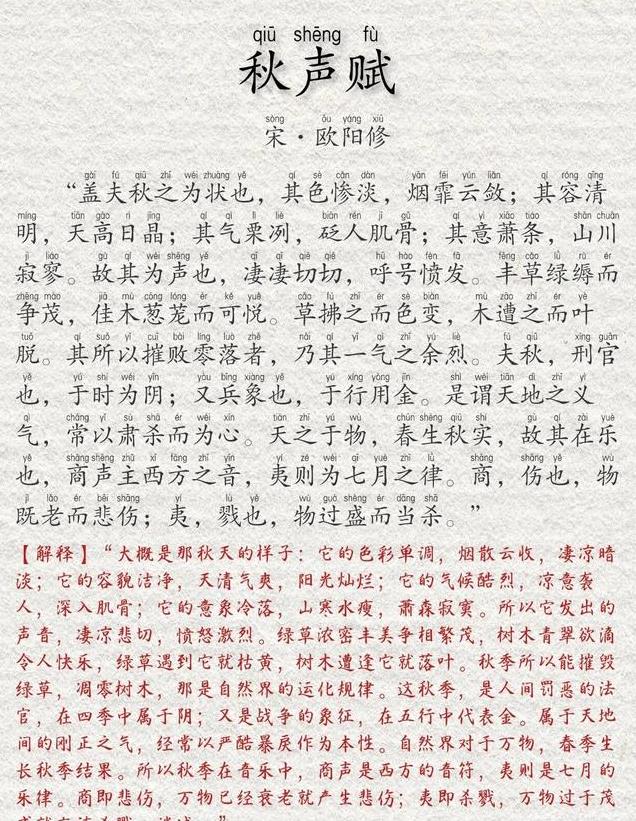 欧阳修恍然大悟,原来这是秋天的声音啊。想那秋天,烟霏云敛,其色惨淡,天高日晶,其容清明,砭人肌骨,其气栗冽,山川寂寥,其意萧条。草拂之而色变,木遭之而叶脱,这世间万物,又有谁能避得开萧瑟秋风的侵蚀,又有谁能逃脱盛极必衰的宿命呢?