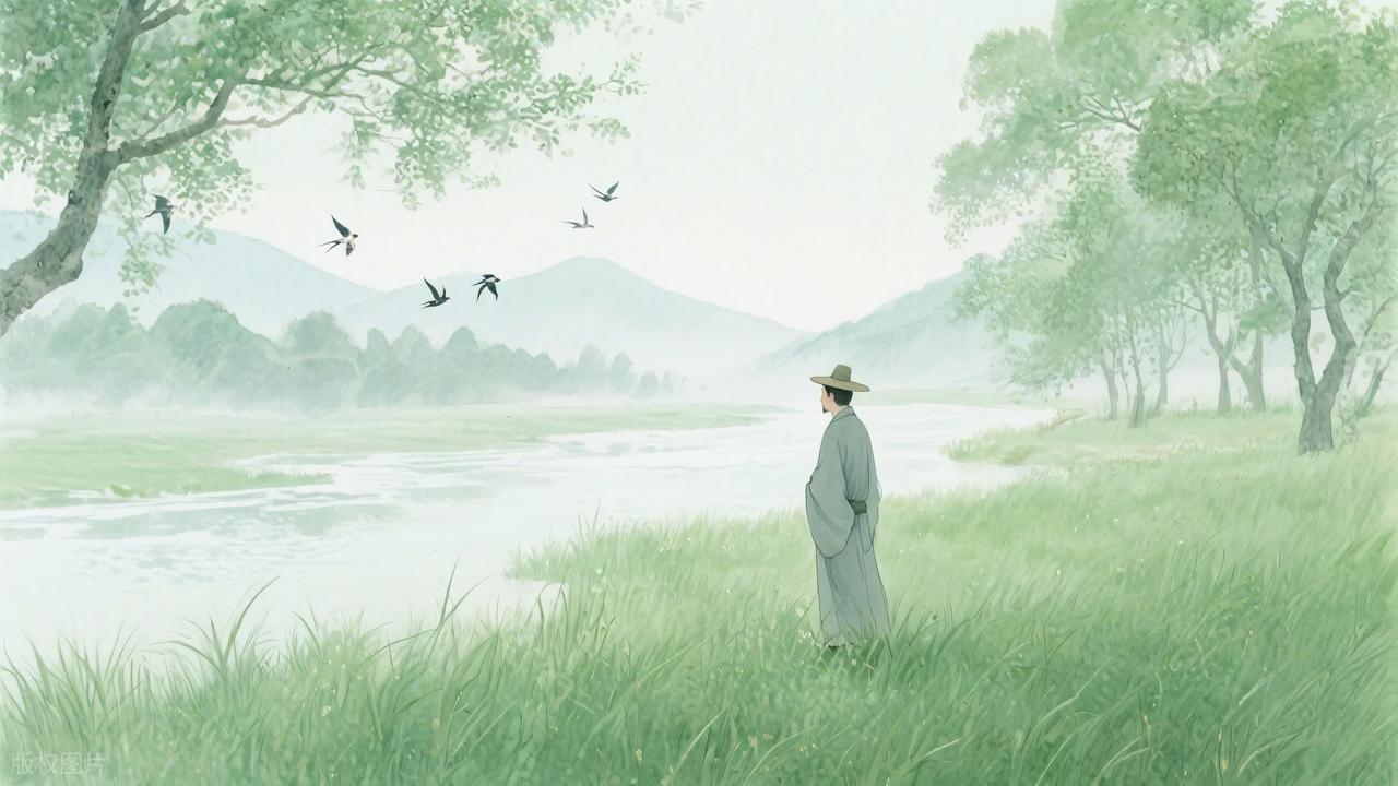 春雨绵绵,已经下了好几天雨。湖水上涨,漫过湖上小桥。不要觉得出行麻烦,步行受阻可以选择乘船出行。你看,前面就有一条小船从柳荫里慢慢驶出。徐俯把眼前实景写出几分虚幻味道。明明是真实存在,那种静雅灵秀的韵味好像山水画卷一样。