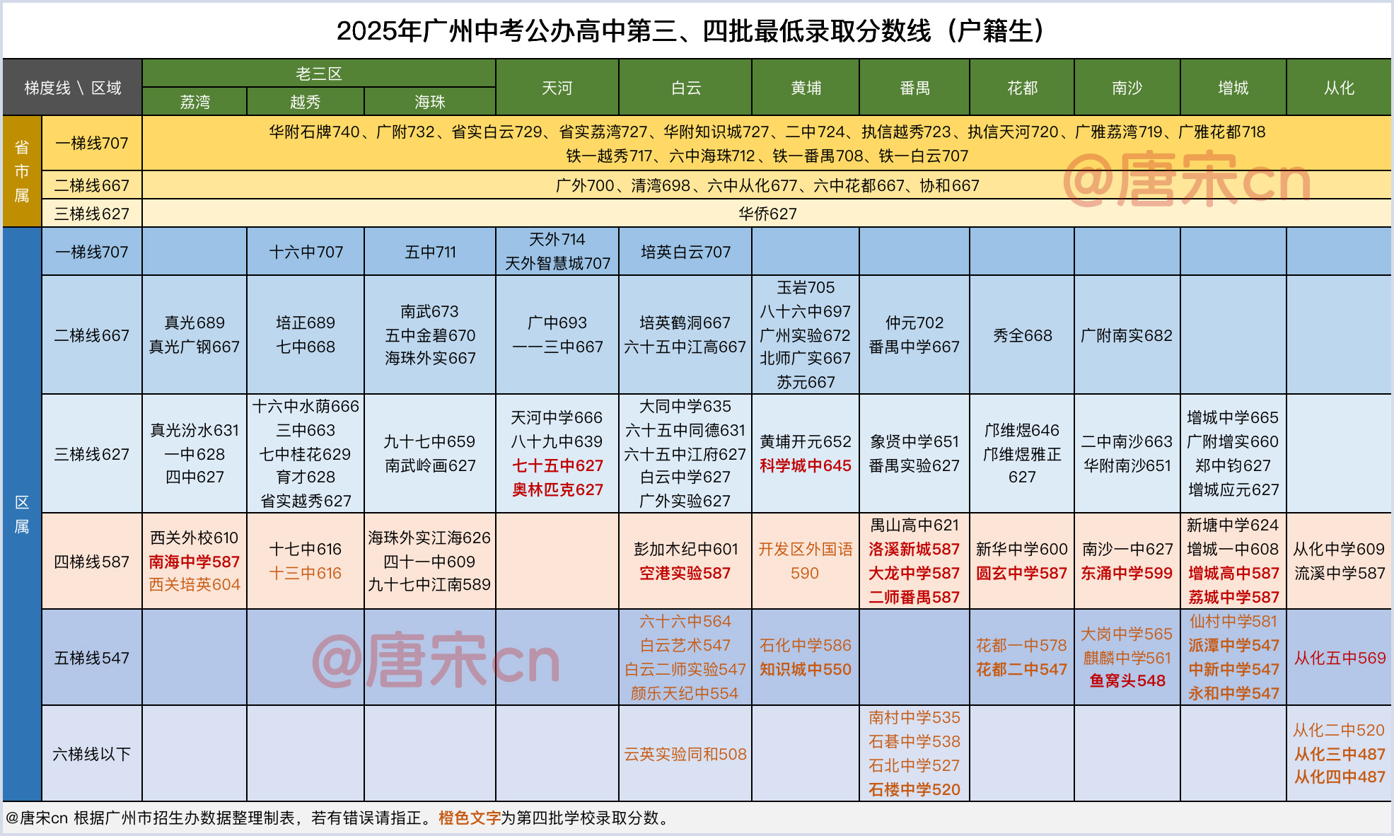 第一梯度线(709分):冲刺省市属重点高中及部分优质区属高中的门槛。第二梯度线(669分):区属示范性高中的竞争线。第三梯度线(629分):天河区公办高中的保底线。第四梯度线(589分):荔湾区、越秀区、海珠区公办高中的保底线。第五梯度线(549分):黄埔区、白云区、番禺区、南沙区、花都区、增城区公办高中的保底线。第六梯度线(509分):从化区公办高中的保底线。。数据说明:预测基于近年录取趋势及新中考难度调整,实际分数线可能因报考人数、试题难度微调,但梯度划分具有参考价值。
