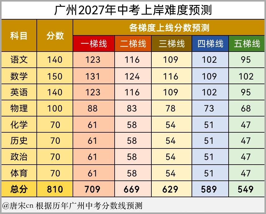 三、2027中考分数线预测:你的目标在哪个梯度?小编结合历届中考录取数据及新中考政策,对2027年广州中考各梯度线进行预测: