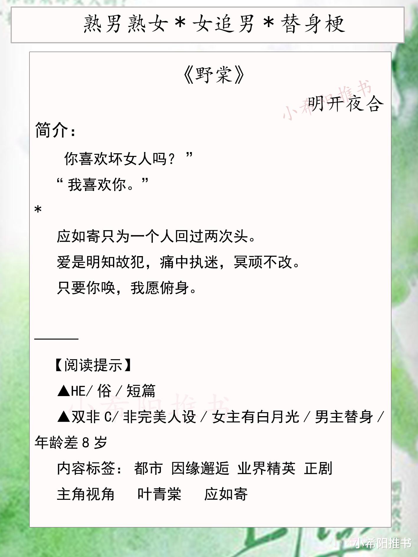 推荐一本熟男熟女做恨文学,女追男,暧昧拉扯感比较强!男主对女主一见钟情,但面不改色;女主把男主当成白月光替身,主动出击。这场爱情游戏,假装高手的男主,早已丢失了真心,后来发现原来自己是替身,想要清醒撤退,女主开始追夫之路!