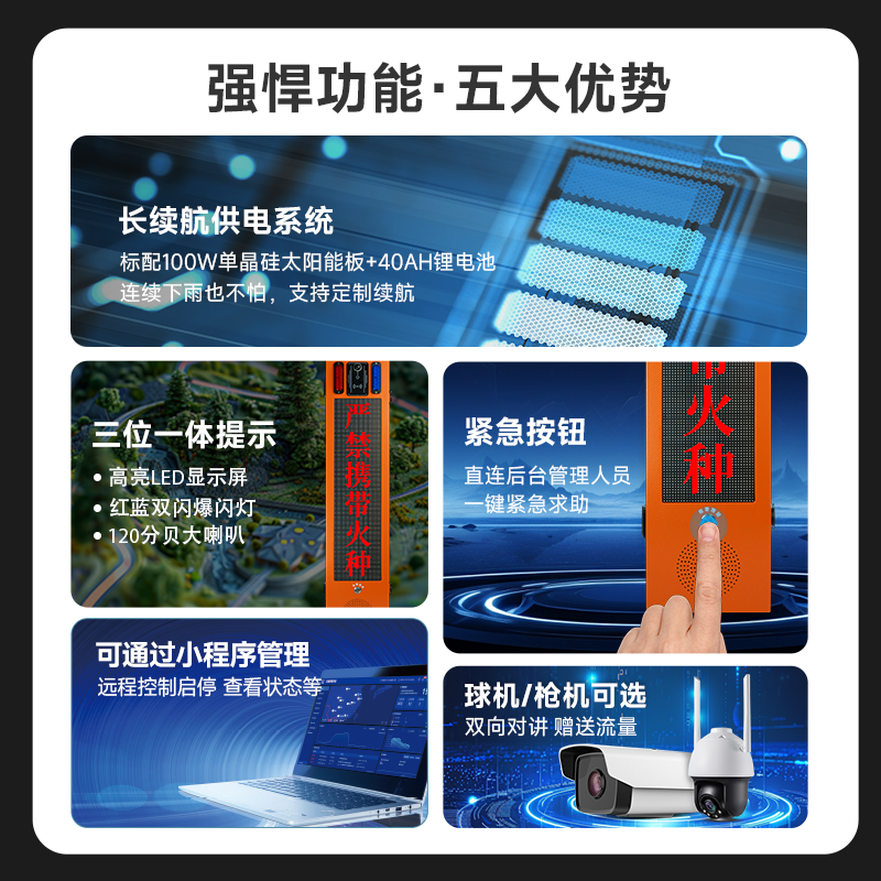 5 大远程功能:通过云平台可直接改警示字幕(如 “施工区域,禁止入内”)、换报警语音、调 120dB 声级、看实时监控、远程喊话,手机 / 电脑端随时操作。