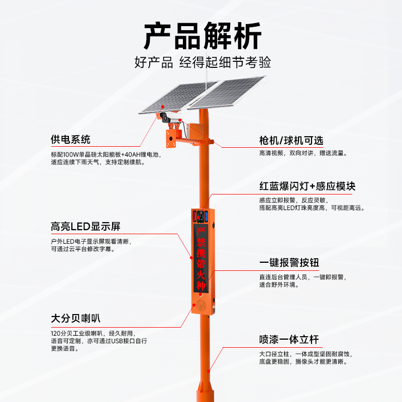 供电方案:标配 100W 太阳能板搭配灌封锂电池,同时支持 市电供电,晴天靠太阳能储能,阴天靠电池续航,无光照环境下也能稳定工作 3-5 天。
