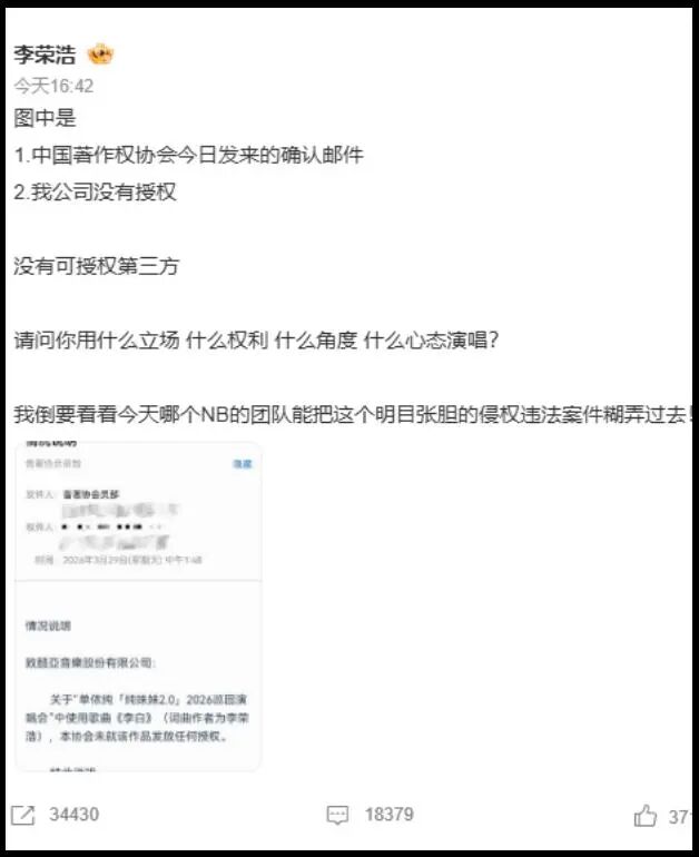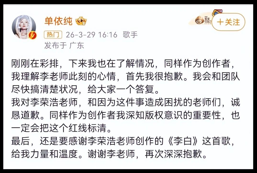 本以为单依纯道歉之后,李荣浩会稍微缓和一点,没想到,等待单依纯进一步回应的间隙,李荣浩再次发文,态度比之前更硬,直接把事情推到了顶点。他特意强调,中国著作权协会已经明确确认,没有给单依纯任何授权,也就是说,单依纯的演唱,就是明目张胆的侵权,没有任何辩解的余地。