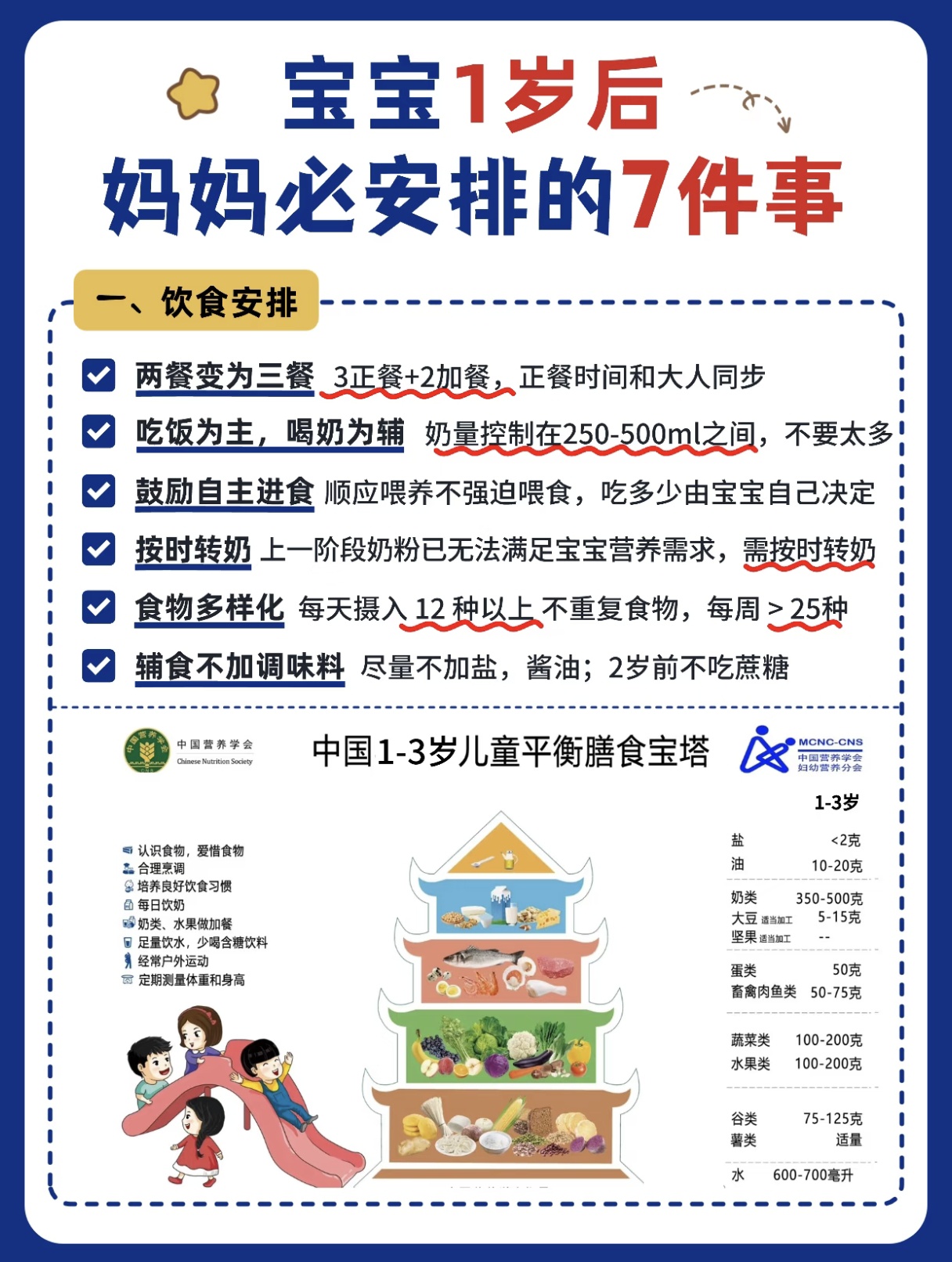 宝宝满1岁,标志着从婴儿期迈入学龄前阶段,身体、认知和社交能力都进入快速发展期。妈妈应及时调整养育重点,帮助宝宝顺利过渡。饮食应从“以奶为主”逐步转为“以饭为主”。每天安排3顿正餐加2次加餐,与家人同步进餐,培养规律饮食习惯。奶量控制在250-500毫升,避免影响正餐。辅食需多样化,每天至少12种、每周超过25种食物,尽量不添加盐、酱油和蔗糖,保护宝宝味觉及肾脏。