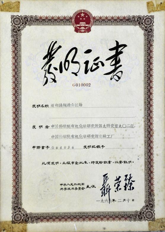 1965年,“液相法制造全氟油”成果获国家发明奖。在黄维垣的领导下,有机所又陆续研制出用于陀螺仪的氟氯油、氟溴油及含氟材料,如氟塑料、氟橡胶等。