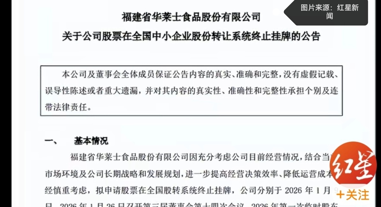 2026年2月12日,华莱士母公司华士食品正式从新三板摘牌,结束近十年挂牌历程。早在1月9日公司就宣布拟退市,1月22日停牌,2月11日发布终牌公告,全程主动申请、合规完成。官方给出的理由很实在:结合经营现状、市场环境与长期战略,提高决策效率、降低运营成本。眼下华莱士一边要应对塔斯汀等新品牌的强势围剿,一边自身业绩增速放缓、竞争压力陡增,退市更像是一场主动减负、求生存的调整。