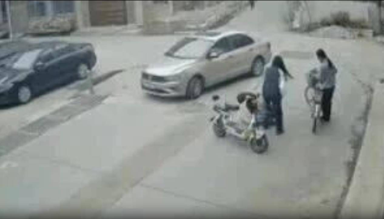 随白轿车后面骑电动车驶来的二女生(被告)见状停车,上前扶起老人。