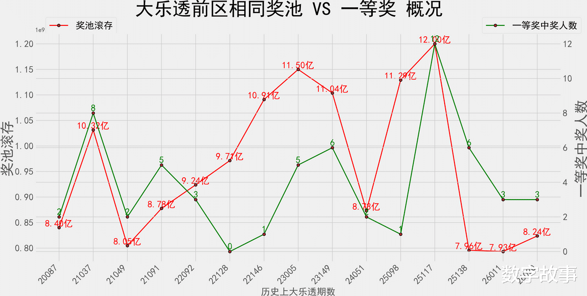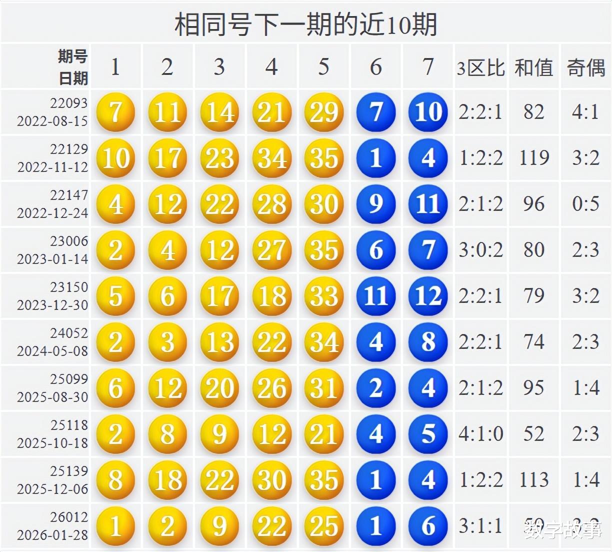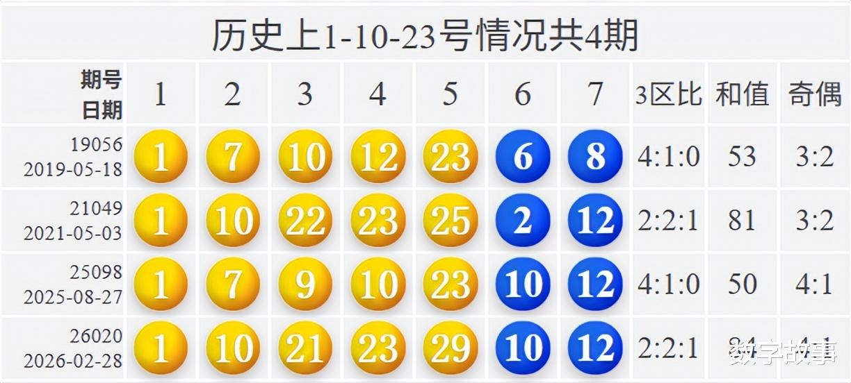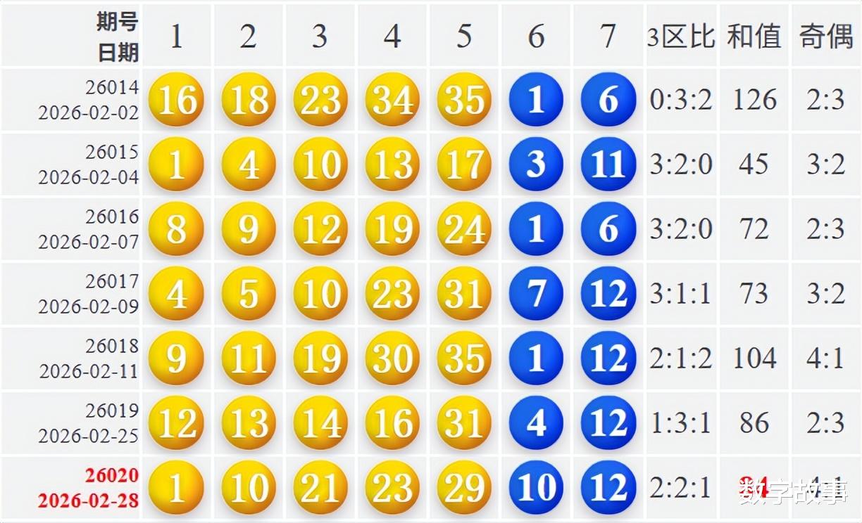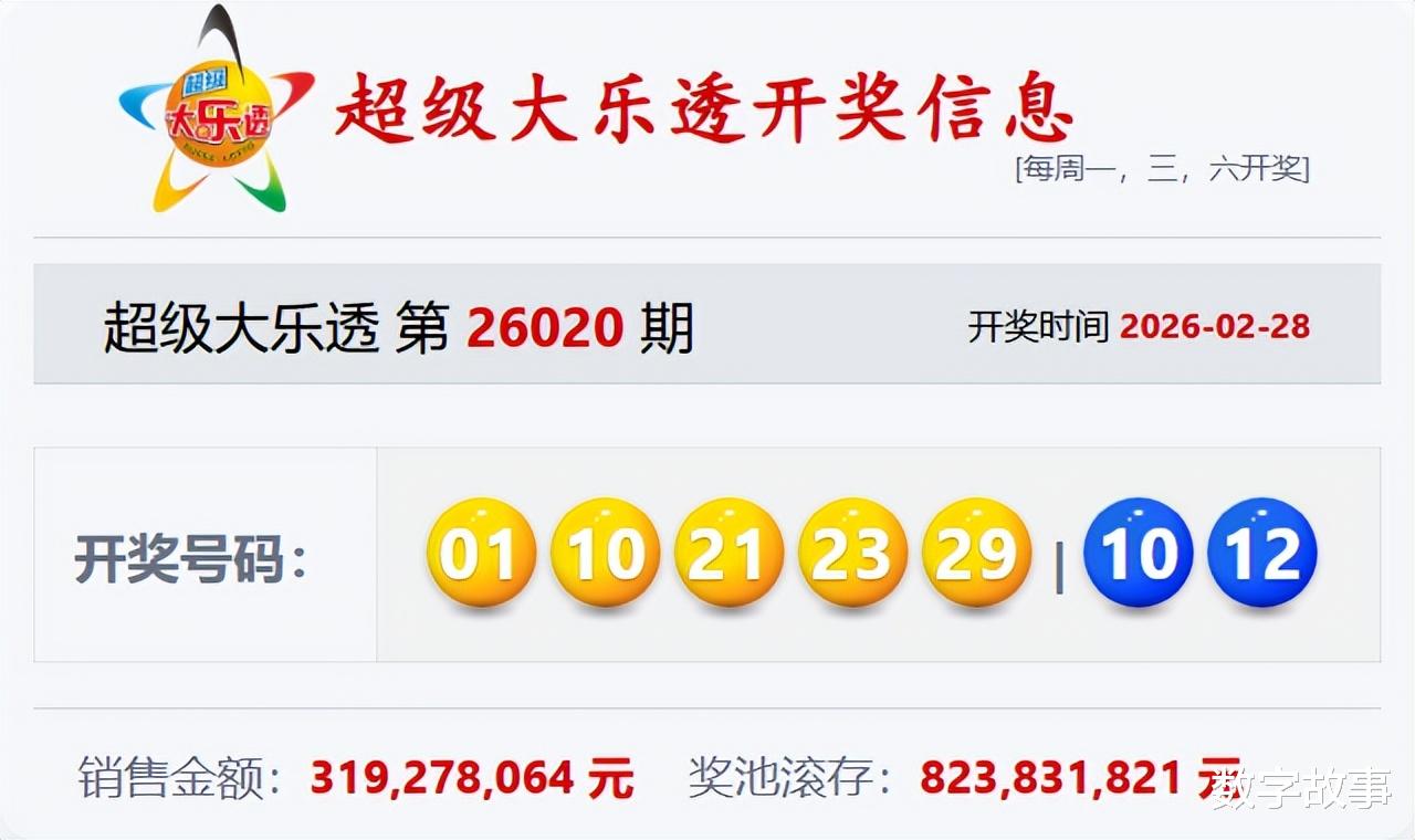 文末有大乐透前区号1-10-23, 21-23-29的历史统计。【体彩大乐透26020期开奖结果及统计】前区号组合历史上有3期四球相同,后区10-12中断64期遗漏;3注一等奖,奖池8.238亿。大乐透26020期开奖结果及中奖情况:出奖时间: 2026-02-28 星期六 前区号:1-10-21-23-29后区号:10-12后区重号叠码:12后区隔期下落:12前区奇偶比:4:1 前区和值:84前区跨度:28 三区比:2:2:1没有连号