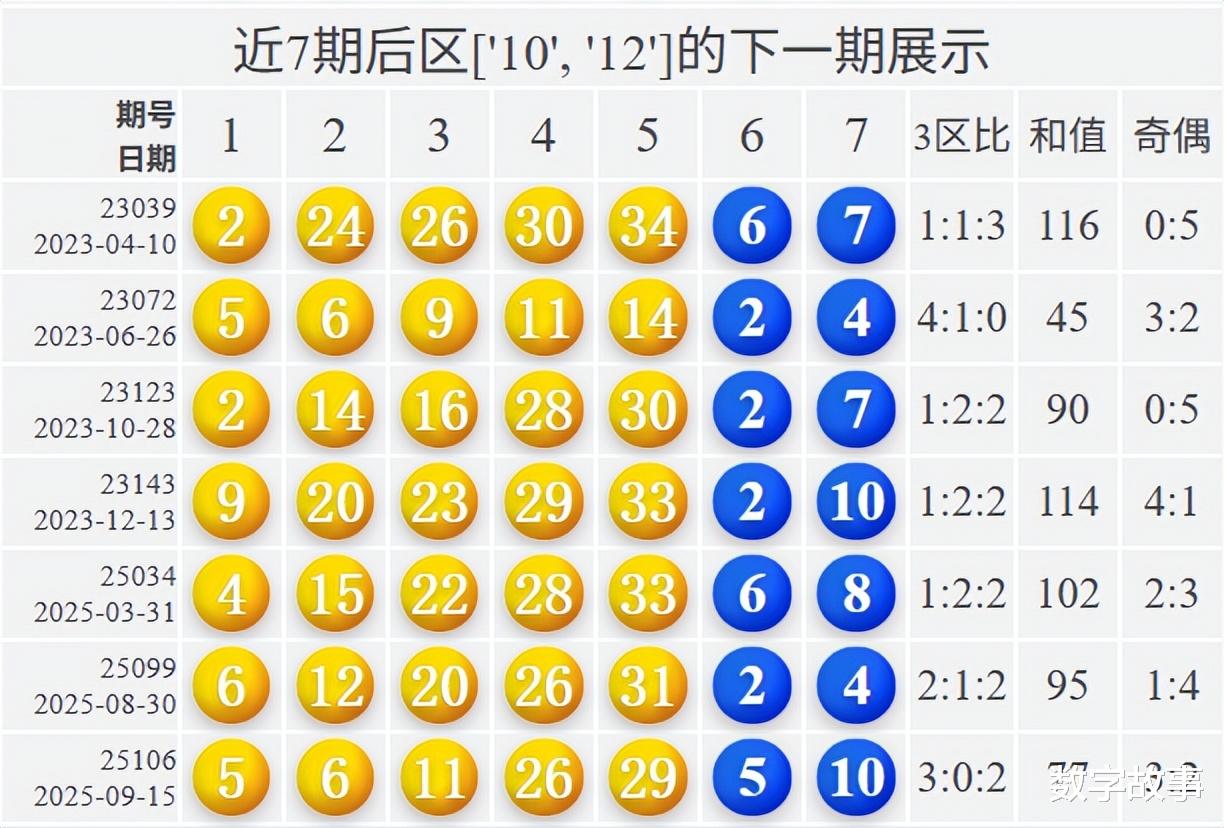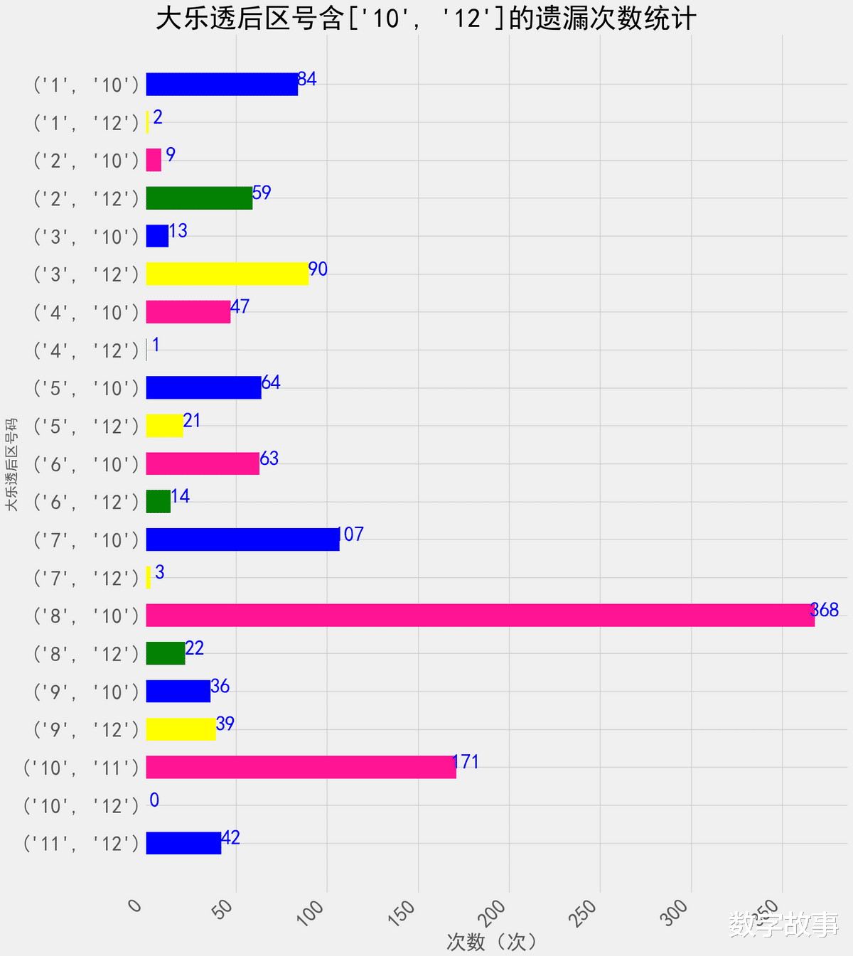 大乐透后区含10或12的双号遗漏次数统计大乐透后区组合10-12近150期出了4次,这次中断了64期遗漏。