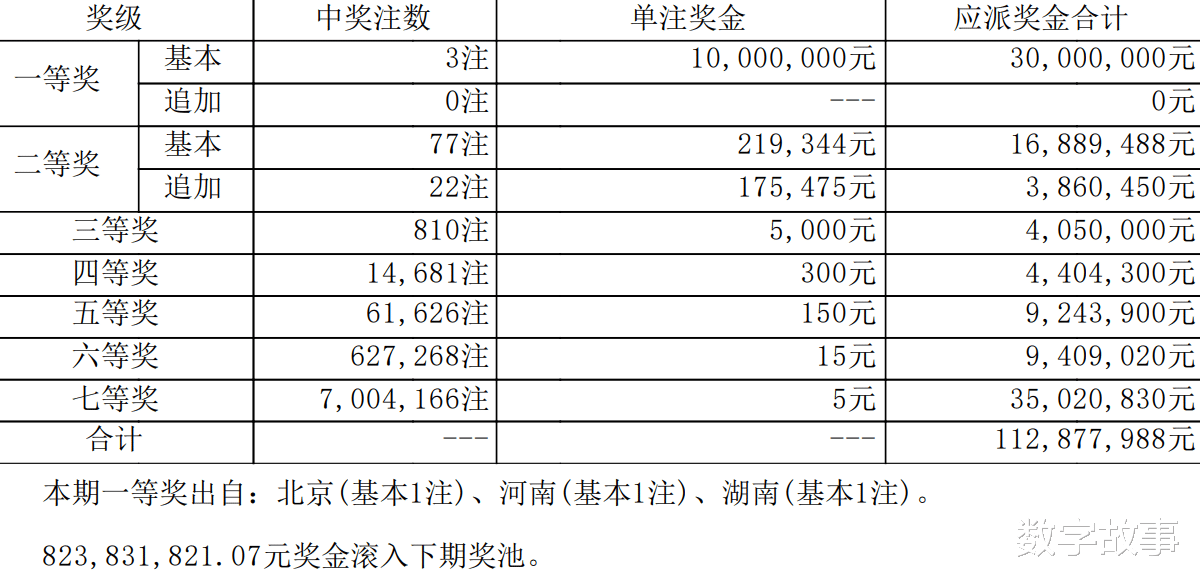 大乐透26020期一等奖:3注,追加: 0注二等奖:77注,追加: 22注。本期全国销售金额:3.193 亿 奖池滚存:8.238 亿.近15期奖池滚存, 中奖情况等信息: