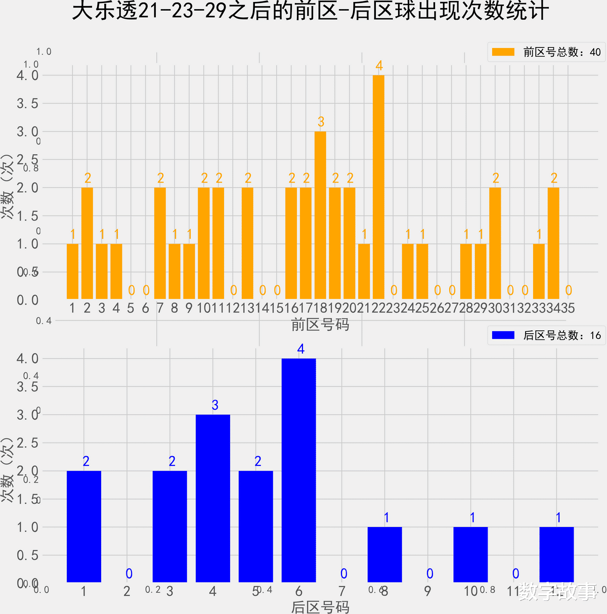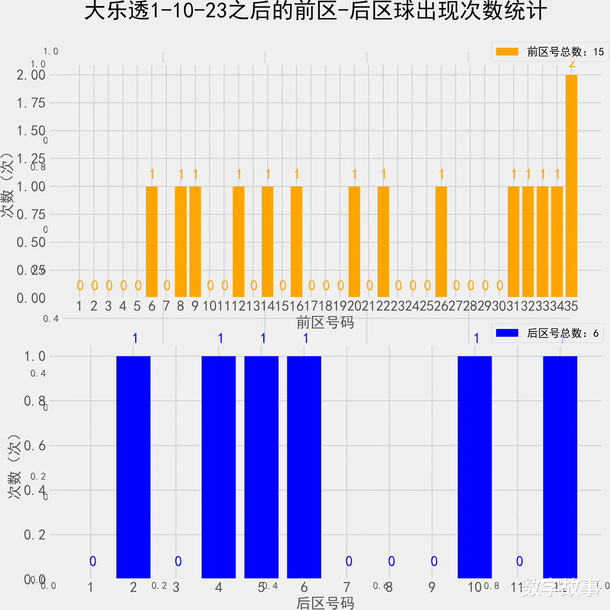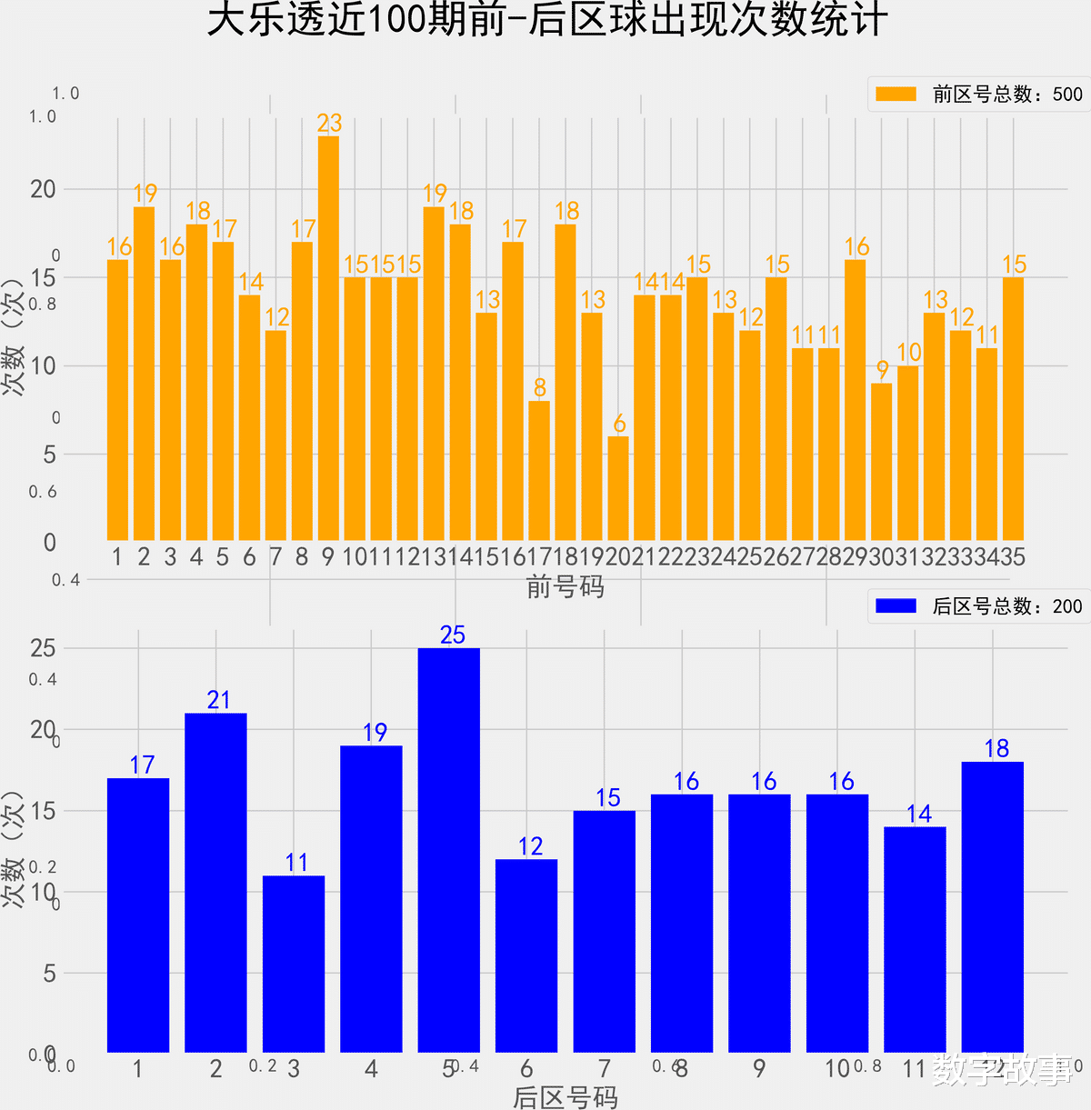大乐透近100期前后区号统计情况统计样本数据: 500个前区号码 200个后区号码