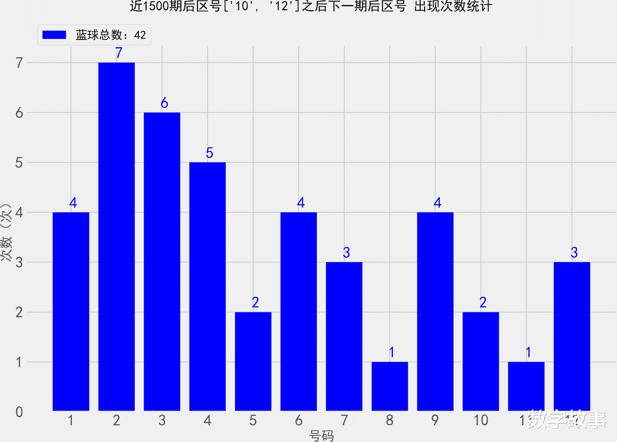 统计近1500期后区号10-12之后, 各后区号的出现次数大乐透26020期后区号是10-12找出近1500期后区10-12号之后,下一期出现的所有后区号,统计其出现次数。除开这一期,共出现了21次10-12后区号那么统计的样本数据是42个