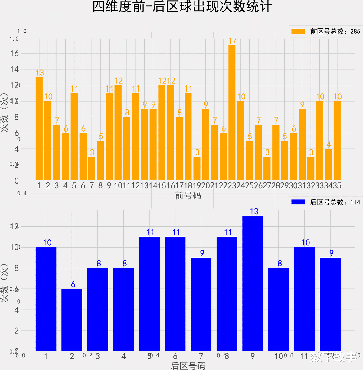 => 统计出现概率综合以上4个纬度的号码,共57期根据出现次数,分为热号,冷号,其他的为温号。统计样本数据: 285个前区号码 114个后区号码