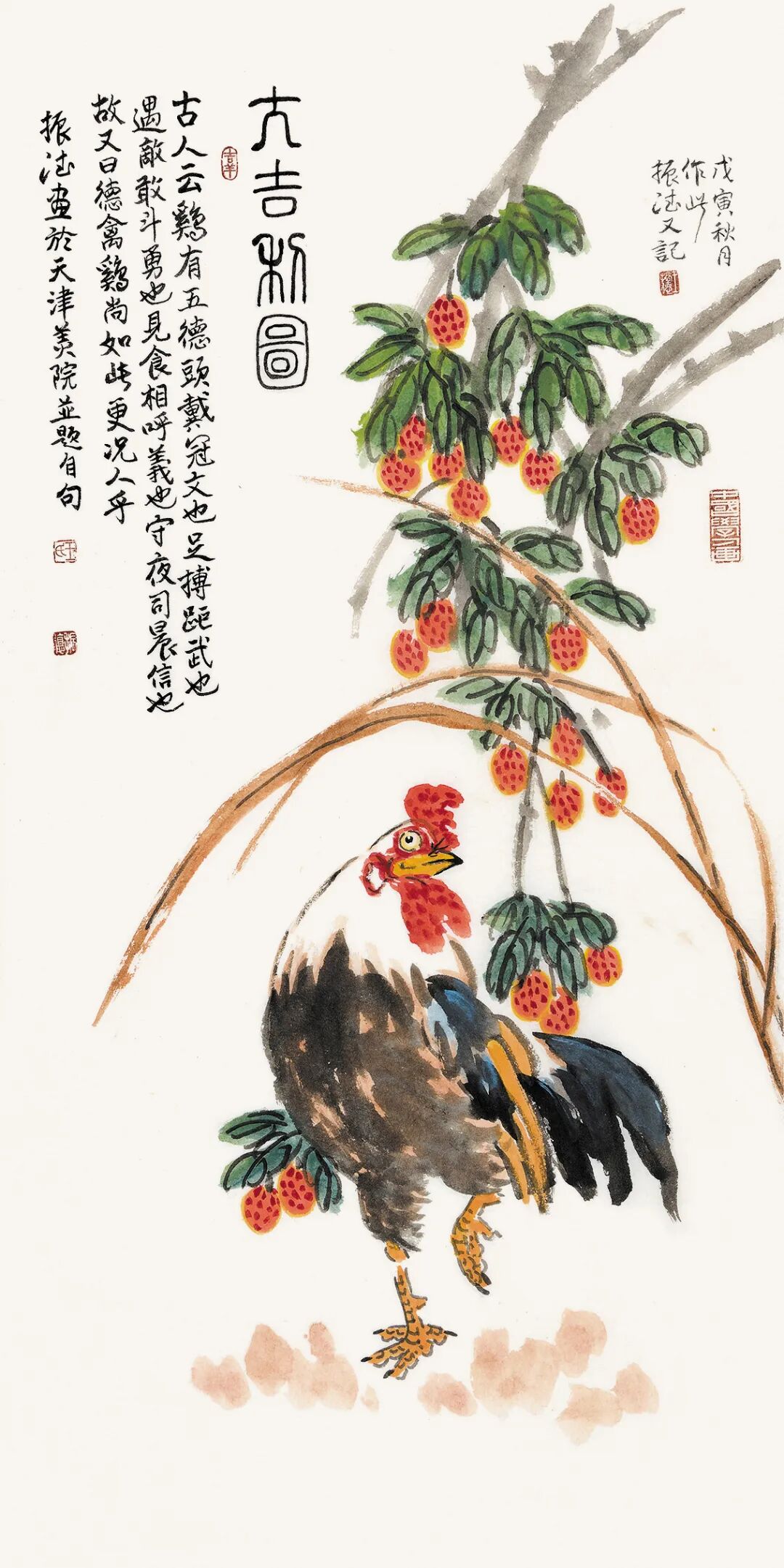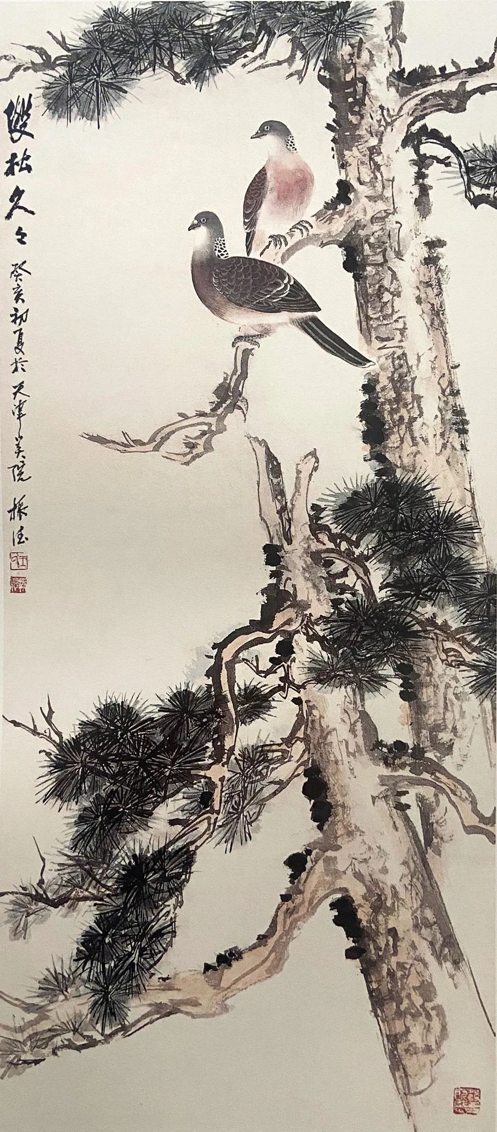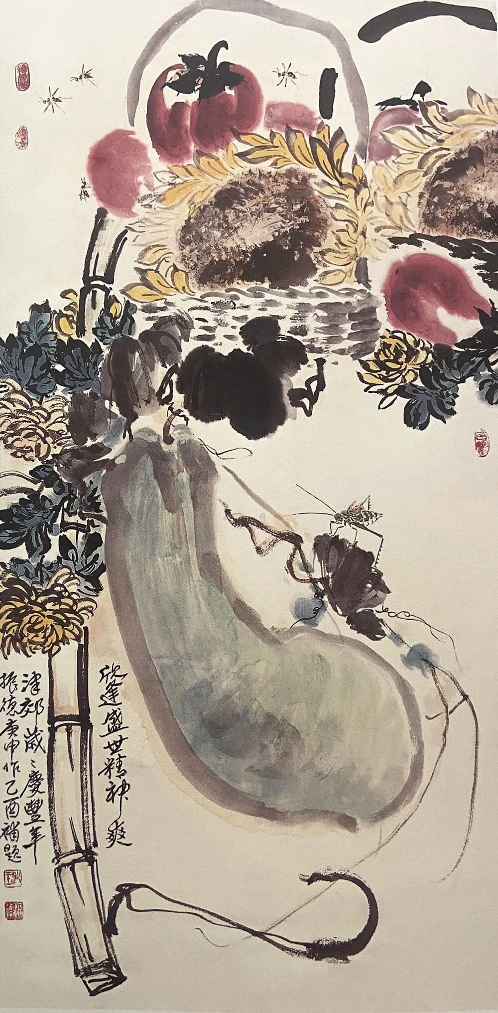 他的花鸟画题材特别丰富,却每一幅都有明确的意涵,不是随便涂绘物象。早年他下过苦功临习历代名家,从宋人的精致小品到明代林良、吕纪的工写结合,再到清代李复堂、华新罗的灵动,还有吴昌硕、齐白石的意趣,都吃透了精髓,所以画《白描花鸟》时线条劲挺又灵活,画《玉兰山鹊》《国色天香》时,花瓣的层次、鸟儿的神态,都带着古典花鸟的雅致劲儿,传统功底一看便知。但他不满足于仿古,更爱从生活里找灵感,写生的《水仙》清灵、《藤萝》缠绕有生机、《腊梅》枝干苍劲、《菊花》带着霜气,每一笔都能让人感受到花草真实的生长状态,鲜活又自然。更特别的是他那些“有话说”的作品,比如《大吉利图》《吉庆丰收》是借物象传吉祥,《榴实奉亲》《望燕思母》藏着对家人的牵挂,《世世清白图》《有为结果图》更是把“做人要清白、做事要务实”的道理画了进去,连古砖拓片上他都能补画几笔,让老物件和新笔墨对话,满是学人的巧思。