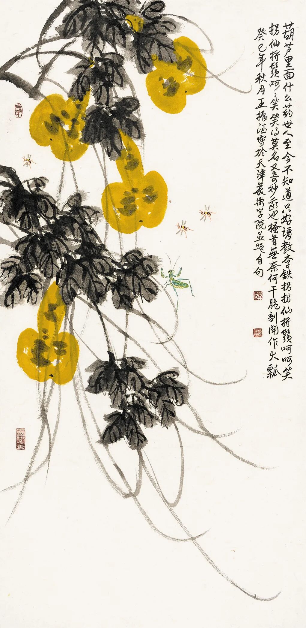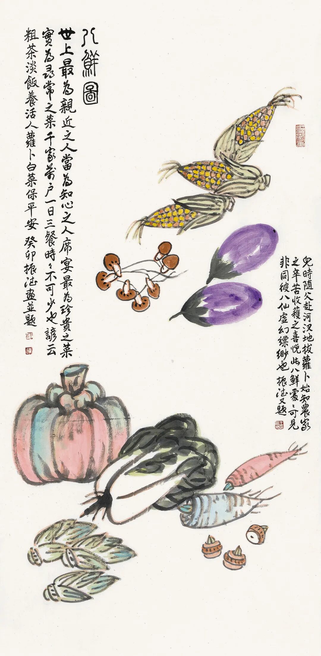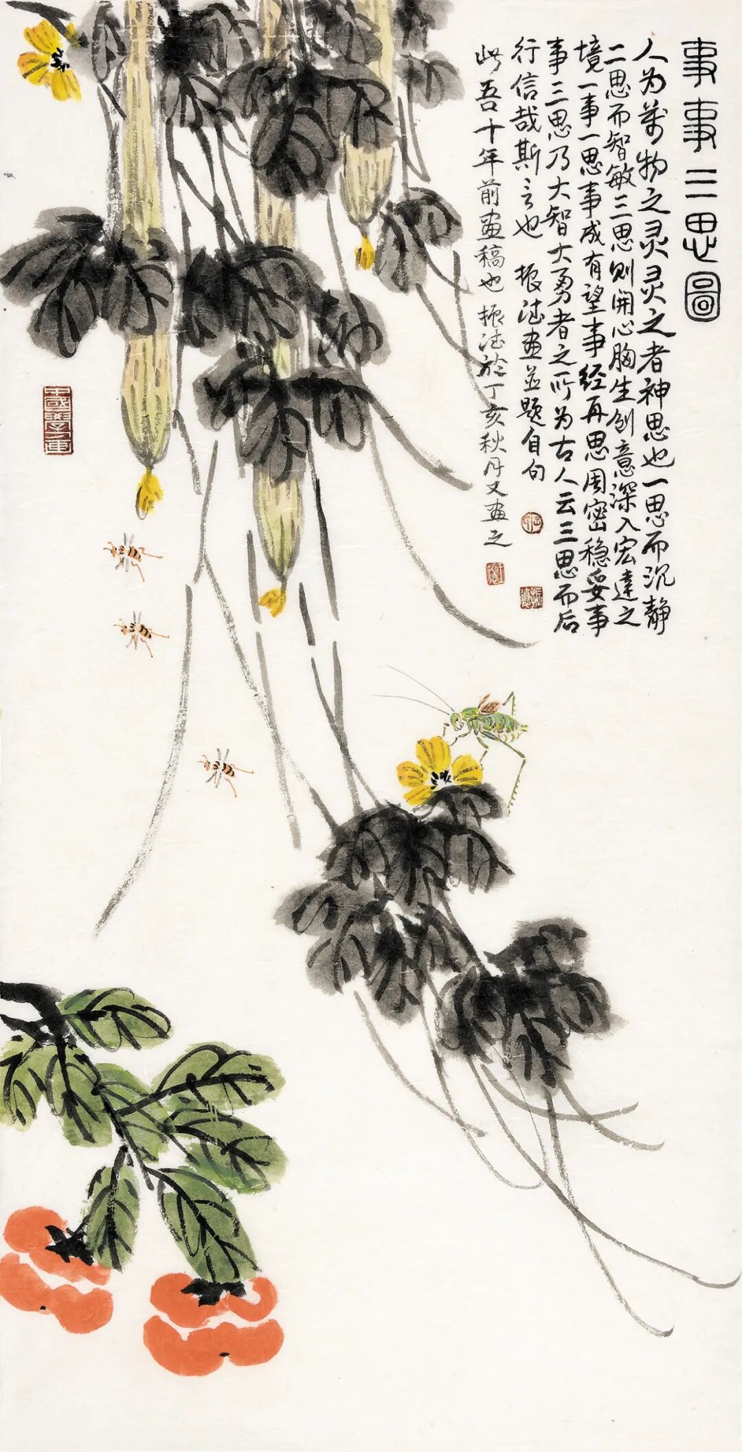 他的花鸟画题材特别丰富,却每一幅都有明确的意涵,不是随便涂绘物象。早年他下过苦功临习历代名家,从宋人的精致小品到明代林良、吕纪的工写结合,再到清代李复堂、华新罗的灵动,还有吴昌硕、齐白石的意趣,都吃透了精髓,所以画《白描花鸟》时线条劲挺又灵活,画《玉兰山鹊》《国色天香》时,花瓣的层次、鸟儿的神态,都带着古典花鸟的雅致劲儿,传统功底一看便知。但他不满足于仿古,更爱从生活里找灵感,写生的《水仙》清灵、《藤萝》缠绕有生机、《腊梅》枝干苍劲、《菊花》带着霜气,每一笔都能让人感受到花草真实的生长状态,鲜活又自然。更特别的是他那些“有话说”的作品,比如《大吉利图》《吉庆丰收》是借物象传吉祥,《榴实奉亲》《望燕思母》藏着对家人的牵挂,《世世清白图》《有为结果图》更是把“做人要清白、做事要务实”的道理画了进去,连古砖拓片上他都能补画几笔,让老物件和新笔墨对话,满是学人的巧思。