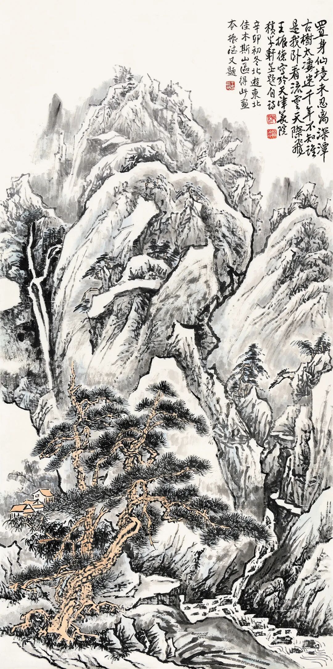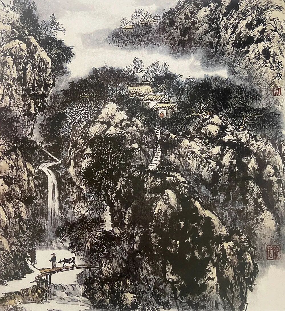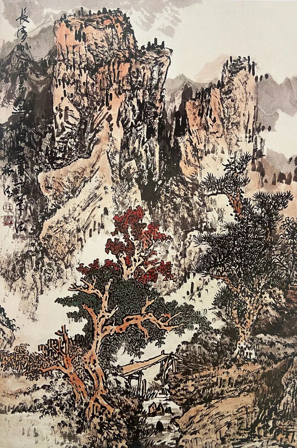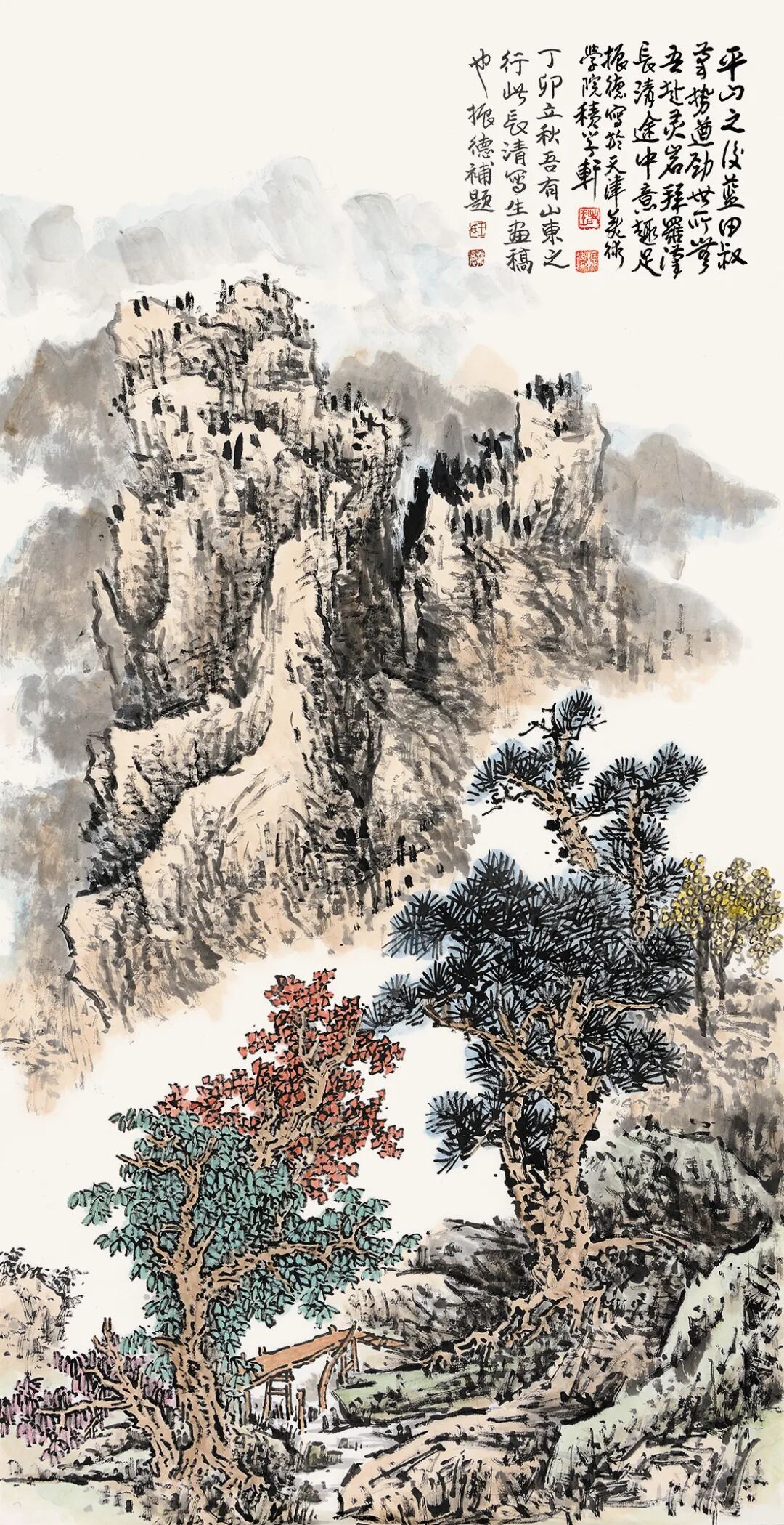 山水画上,他同样把“文心”藏在丘壑里,不是只追求奇峰怪石的视觉冲击,而是讲究意境的营造和文化的呼应。他的山水里能看到传统的笔墨法度,皴擦点染都有来路,比如有些作品带着“元四家”的淡远,有些又有明清山水的苍润,但他会把自己对自然的观察、对生活的理解加进去——画江南水乡时,水色的朦胧、屋舍的雅致,透着平和的生活气息;画北方山水时,山石的厚重、林木的挺拔,又有一股子硬朗劲儿。而且他常爱在画上题诗,诗句和画面呼应,比如画秋山就题上“秋高气爽千山秀”,让观者既能看画的笔墨,又能品诗的意境,真正做到了“诗中有画,画中有诗”,这也是他“诗文书画合璧”追求的最好体现。