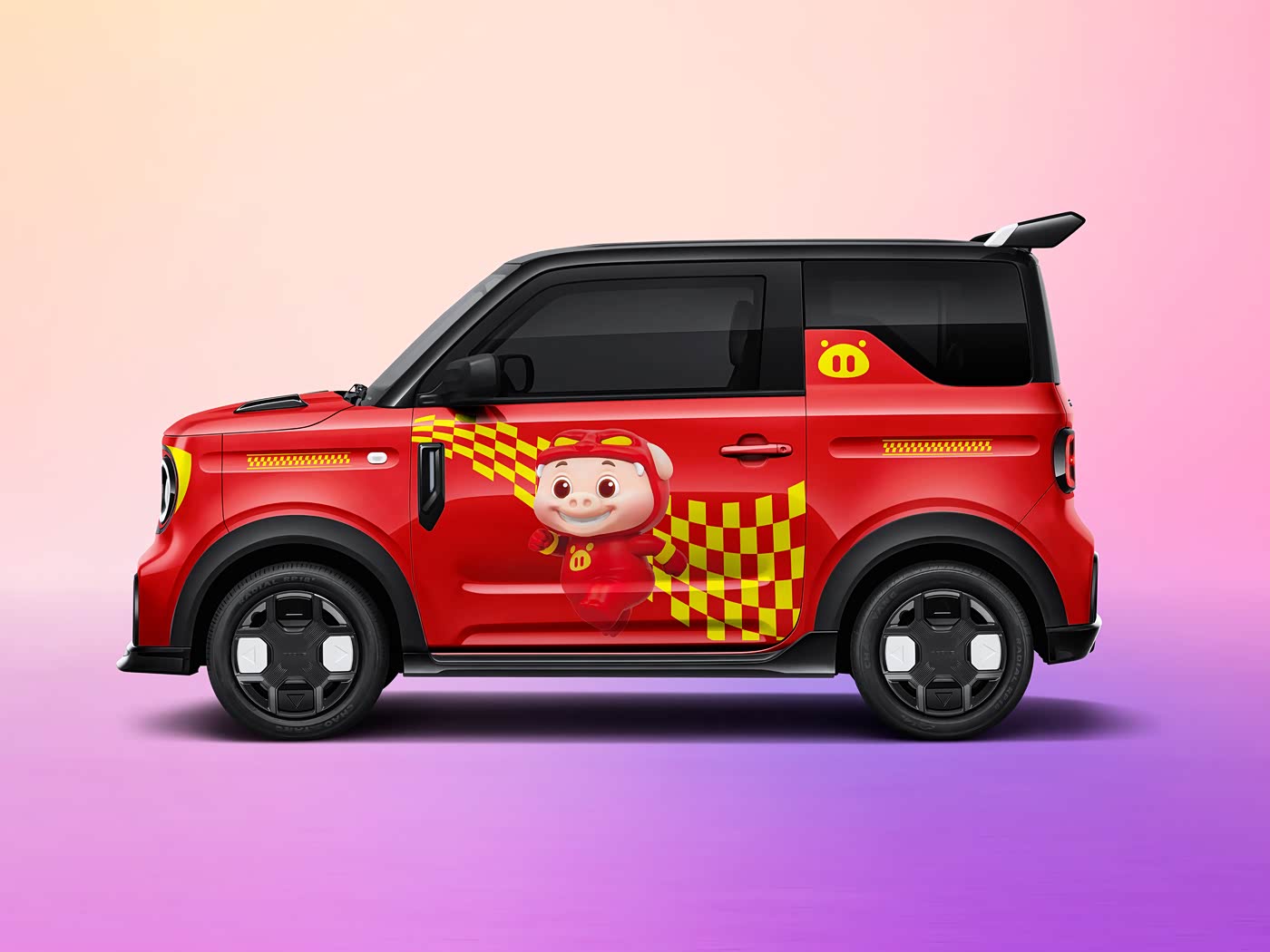 这款新车最特别的就是它的涂装了,红色打底,车侧有猪猪侠动漫角色贴纸。再加上车头两个圆圆的大灯以及短小的小方盒子造型,就会显得比较萌,这一点对于年轻女性消费者应该很讨喜。