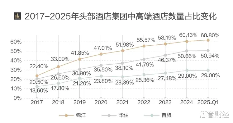 《2025年中国酒店业心动趋势报告》显示,锦江、华住、首旅旗下中高端酒店占比在逐年提升,锦江自2024年占比已超60%。