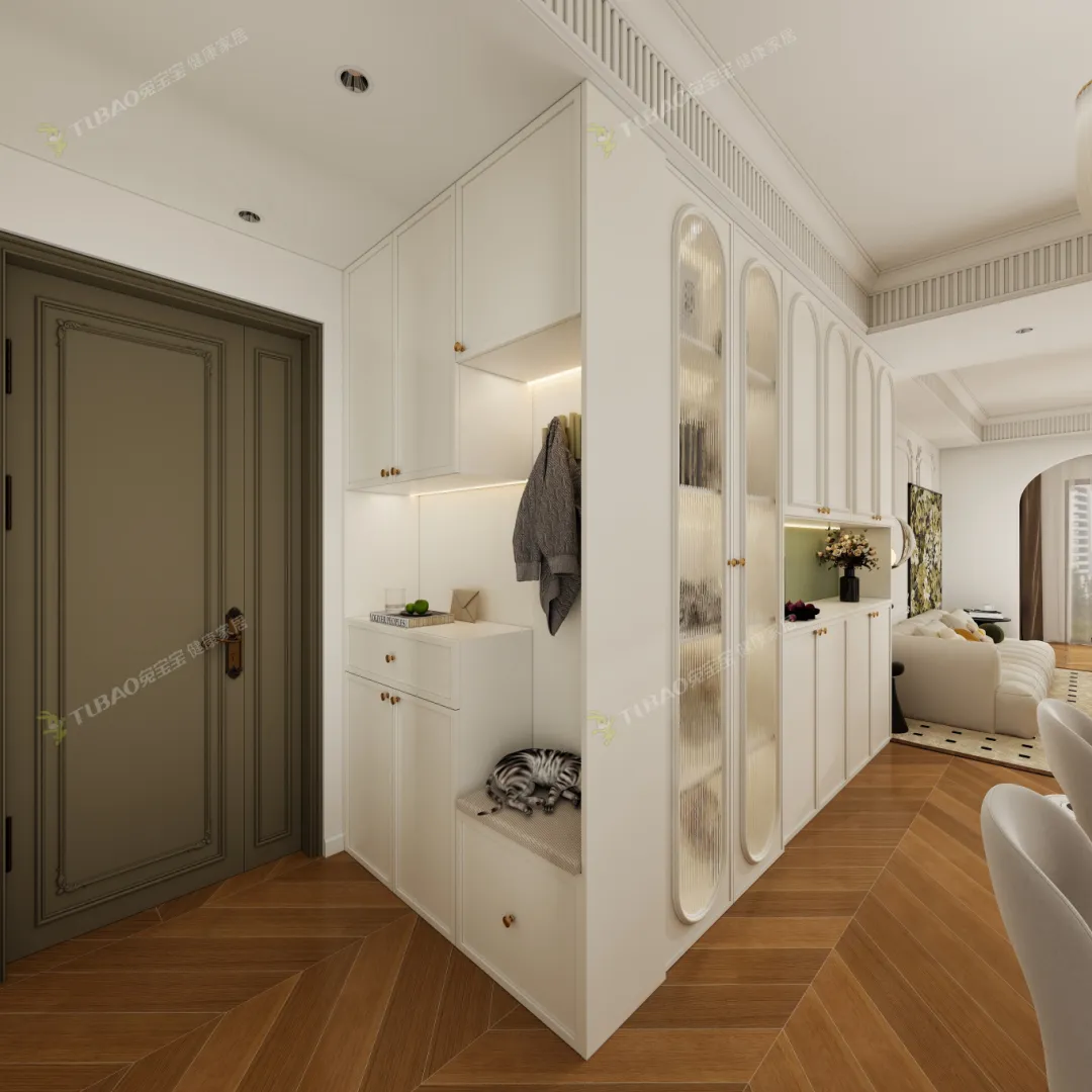 入户玄关柜以其流畅而优美的设计,巧妙地优化了空间布局,点缀着精致的法式装饰细节,为踏入家门的那一刻增添了一份仪式感,仿佛每一次回家都是一场精致生活的开启。玄关柜中融入了换鞋凳,为更换鞋履提供了便利,更以其和谐的色调与法式风情相呼应。