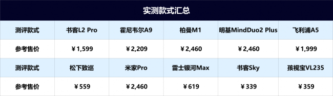 测了多少款:这次一共测了10款,从几百到两三千的都有。不是我偏心,是热门款实在太多,钱包扛不住,只能选大家问得最多的几款。不过这些基本覆盖了市面上主流品牌,书客、明基、霍尼韦尔、柏曼、松下、孩视宝这些都在里面。