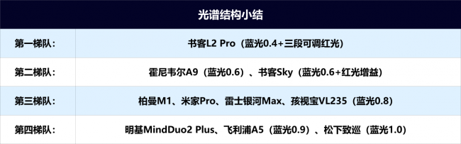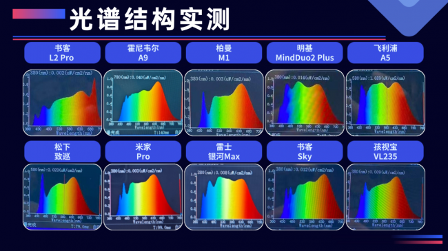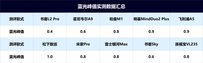 另一种是紫光激发,用紫色芯片代替蓝色芯片,从源头上减少有害蓝光产生,好的能做到0.4以内。这次测下来,紫光激发的几款蓝光峰值明显更低,长时间用眼睛确实没那么累。